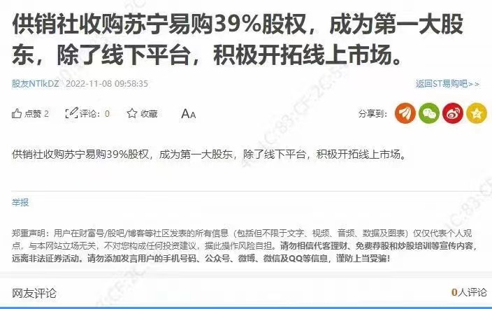 龙商网消息: 11月8日上午,市场传闻称供销社收购苏宁易购39%股权,成为第一大股东,除了线下平台,积极开拓线上市