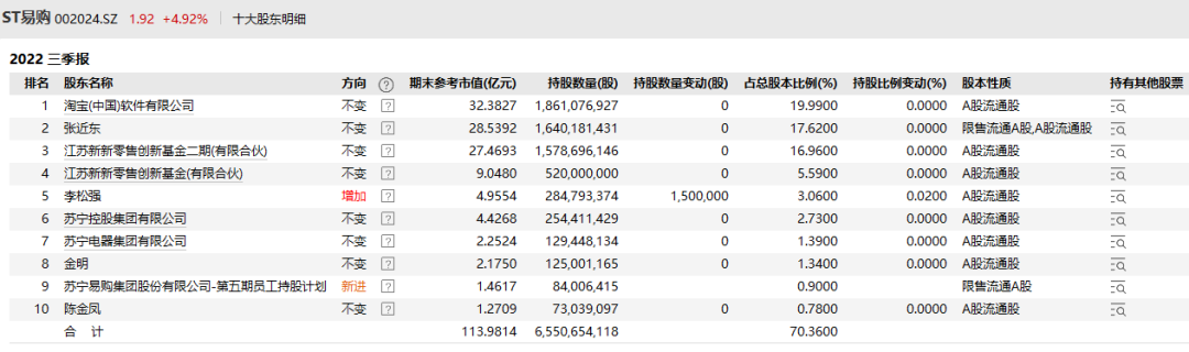 Wind(万得)数据显示,截至今年9月30日,ST易购第一大股东为淘宝(中国)软件有限公司,持股比例为19.99%;第二大股东为张近东,持股比例17.62%;第三大股东为江苏新新零售创新基金二期(有限合伙),持股比例16.96%。