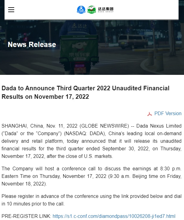 龙商网消息:中国本地按需配送和零售平台达达集团近日宣布,将于2022年11月17日(周四)美国股市收盘后发布截至2022年9月30日的第三季度未经审计的财务业绩。另外,公司将于美国东部时间2022年11月17日周四晚上8:30,即北京时间2022年11月18日星期五上午9:30,召开电话会议,讨论收益。