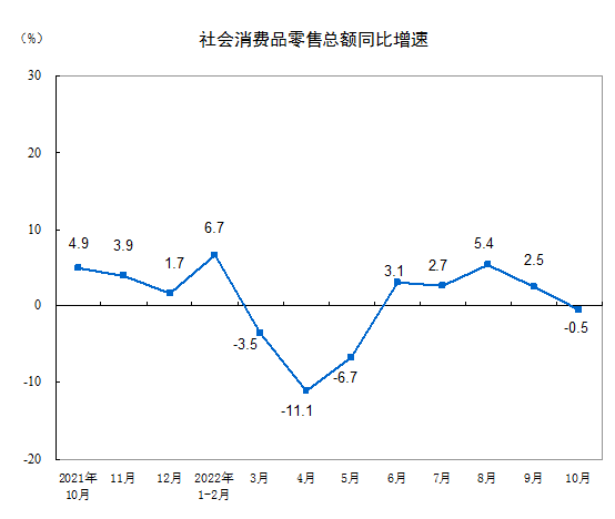 龙商网消息:1-10月份,全国网上零售额109542亿元,同比增长4.9%。其中,实物商品网上零售额94506亿元,增长7.2%,占社会消费品零售总额的比重为26.2%;在实物商品网上零售额中,吃类、穿类、用类商品分别增长16.7%、5.3%、6.5%。10月份,社会消费品零售总额40271亿元,同比下降0.5%。其中,除汽车以外的消费品零售额36575亿元,下降0.9%。1-10月份,社会消费品零售总额360575亿元,同比增长0.6%。其中,除汽车以外的消费品零售额323702亿元,增长0.5%。按消费类型分,10月份,商品零售36171亿元,同比增长0.5%;餐饮收入4099亿元,下降8.1%。1-10月份,商品零售325227亿元,同比增长1.2%;餐饮收入35348亿元,下降5%。