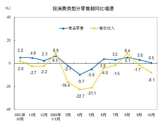 按消费类型分,10月份,商品零售36171亿元,同比增长0.5%;餐饮收入4099亿元,下降8.1%。1—10月份,商品零售325227亿元,同比增长1.2%;餐饮收入35348亿元,下降5%。