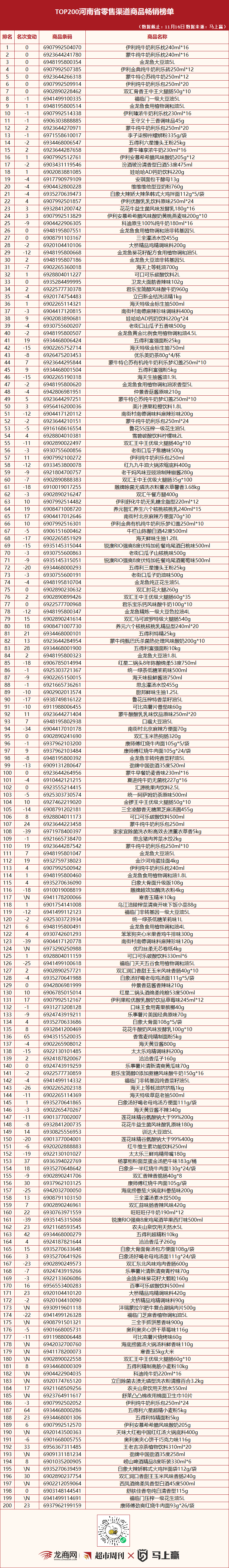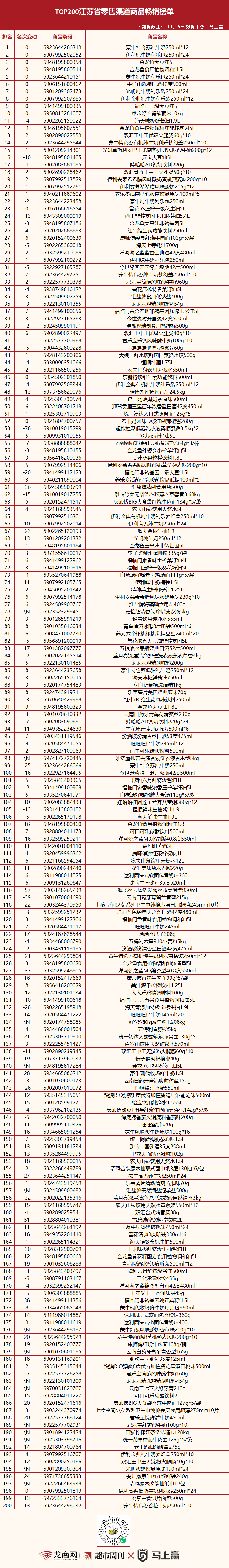 1.本期江苏更新14品,更新7%;河南更新19品,更新9.5%。两地榜单中的相同单品共64品,占比32%,同为两地TOP10的5品:蒙牛特仑苏纯牛奶250ml*12、金龙鱼大豆油5L、金龙鱼食用植物调和油5L、伊利金典纯牛奶利乐砖250ml*12、福临门一级大豆油5L。