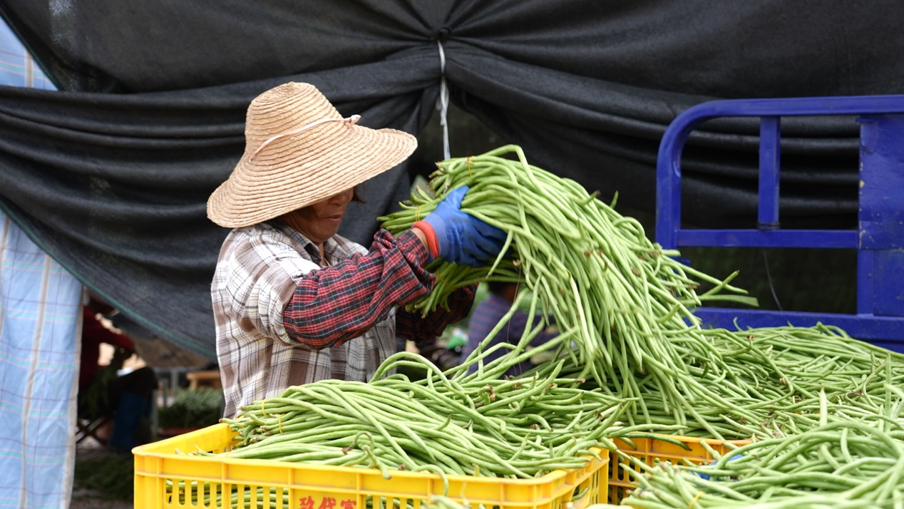 目前“三优”豇豆的产区轮转到了广东廉江县,正值采摘季,几十名来自周边村子的采摘员繁忙地穿梭在一行行的豇豆架中,极其热闹。