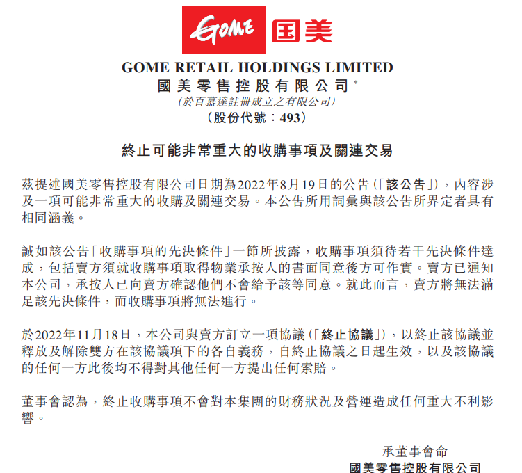 龙商网消息:国美零售近日在港交所发布公告称,终止可能非常重大的收购事项及关联交易。该收购事项具体为:今年8月19日,国美零售发布公告称,公司拟向控股股东黄光裕全资拥有的国美地产控股有限公司,收购鹏融地产(海外)有限公司全部股权。目标公司的主要资产为国美商都物业及湘江玖号物业,双方预期将以向卖方发行国美零售股份的方式结算部分或全部代价。本次公告显示:诚如8月公告中“收购事项的先决条件”一节所披露,收购事项须待若干先决条件达成,包括卖方须就收购事项取得物业承按人的书面同意后方可作实。卖方已通知本公司,承按人已向卖方确认他们不会给予该等同意。就此而言,卖方将无法满足该先决条件,而收购事项将无法进行。11月18日,本公司与卖方订立一项协议,以终止该协议并释放及解除双方在该协议项下的各自义务,自终止协议之日起生效,以及该协议的任何一方此后均不得对其他任何一方提出任何索赔。董事会认为,终止收购事项不会对本集团的财务状况及营运造成任何重大不利影响。