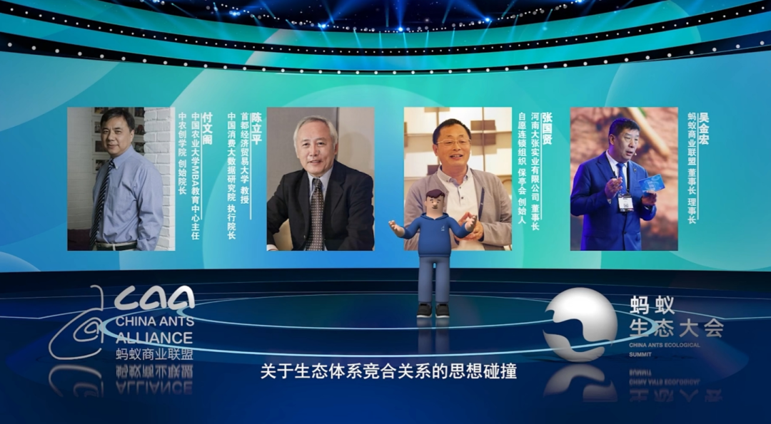 2022蚂蚁生态大会上,首都经济贸易大学教授、中国消费大数据研究院执行院长陈立平教授,中国农业大学MBA教育中心主任、中农创学院创始院长付文阁教授,河南大张实业有限公司董事长、自愿连锁组织保亭会创始人张国贤先生,蚂蚁商业联盟董事长、理事长吴金宏先生,四位大咖同台对话,以开放&竞合关系为题,推演生态体系新时代构想,为大家带来一场思想盛宴。