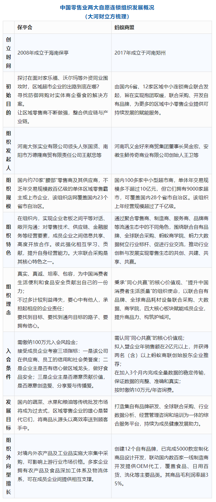 不过,二人对话能被国内工商业广泛关注,是他们身后两个强大的组织。两个组织都能覆盖国内绝大多数省份零售市场,门店数量过万、年交易规模均在千亿级,日均触达消费在数千万级。两大组织创立初衷、战略方向与抓手虽不同,但二者内部的组织紧实性与协同性特征却同样出色。更引人好奇的是,保亭会与蚂蚁商盟本该是竞争体,可粗略概括为“省市级区域商业龙头企业VS市县级超市小霸王”。就如,大张超市在洛阳、金好来在郑州巩义,双方相距仅百公里,企业规模又是10倍差距。那么,二者可有平等对话的依据?