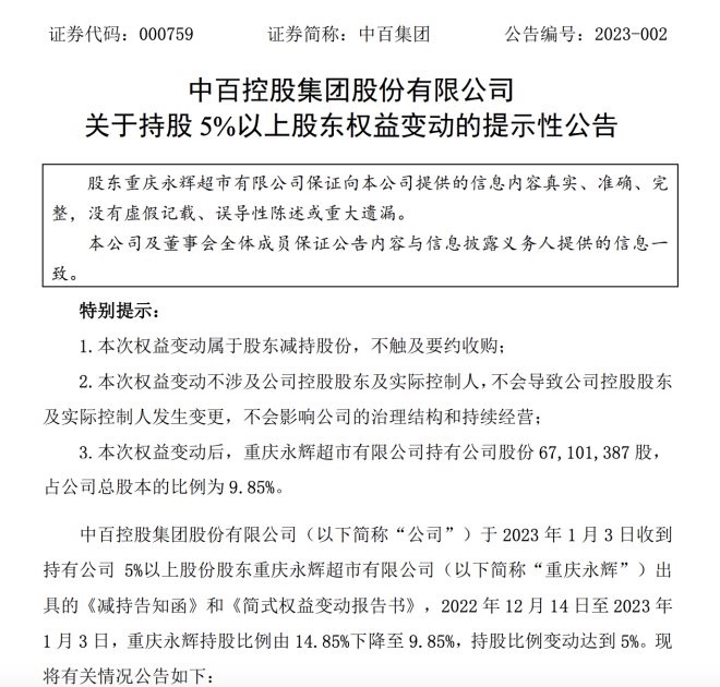龙商网消息: 1月3日晚间,中百集团发布股东减持公告。公告显示,2022年12月14日至2023年1月3日,重庆永辉减持中百集团股份3405.12万股,持股比例变动达到5%。本次减持之后,永辉超市及其一致行动人的持股比例由14.85%下降至9.85%,低于武汉华汉投资管理有限...