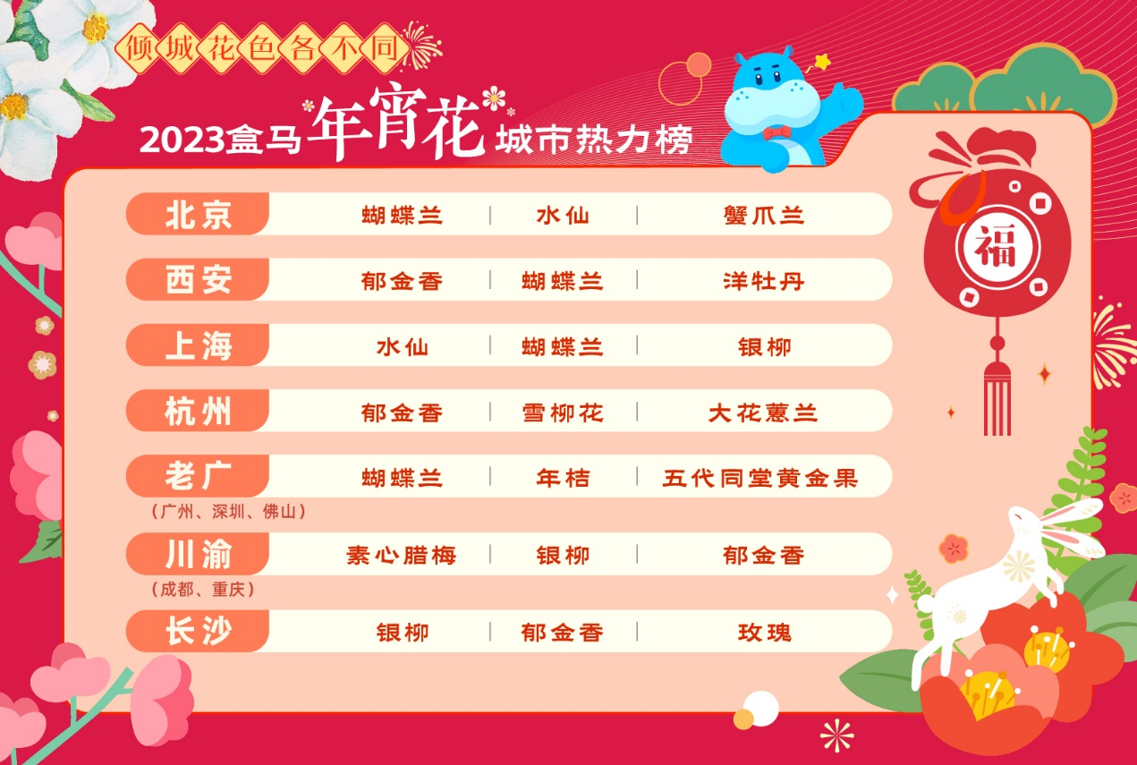 各地用户都爱买什么花?近日盒马发布了《2023年宵花城市排行榜》。数据显示,北京地区销售年宵花排名前三的为蝴蝶兰、水仙和蟹爪兰,上海人最爱买的是水仙,而在广东地区,最受欢迎的年宵花除了蝴蝶兰,还有年桔和五代同堂。
