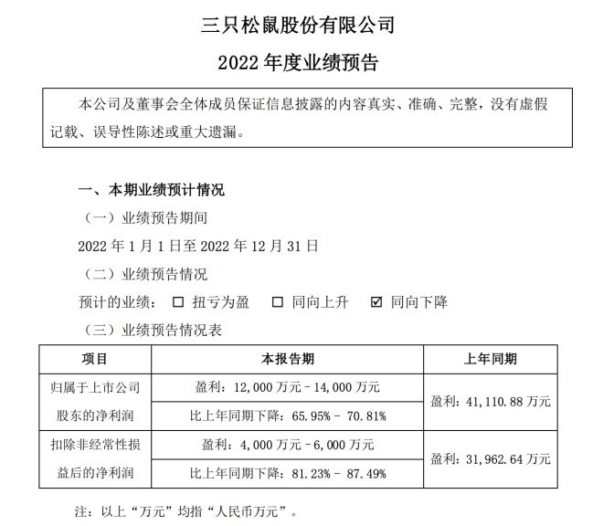 龙商网消息: 日前,三只松鼠公布2022年度业绩预告。公告显示,三只松鼠预计2022年度归属于上市公司股东的净利润为1.2亿元至1.4亿元,同比下降65.95%至70.81%;扣除非经常性损益后的净利润4000万元至6000万元,同比下降81.23%至87.49%。 对于净利下滑,三只...