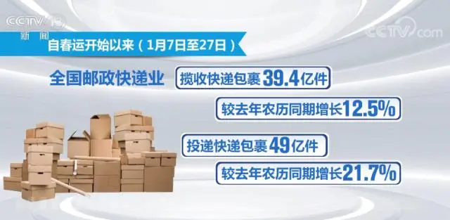 数据显示,自春运开始以来(1月7日至27日),全国邮政快递业揽收快递包裹39.4亿件,较去年农历同期增长12.5%,投递快递包裹49亿件,较去年农历同期增长21.7%。