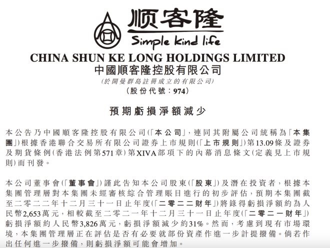 龙商网消息:2月1日晚间,中国顺客隆发布业绩预告。2022年度,中国顺客隆预期将录得亏损净额约为2653万元,相较2021年度的亏损净额约3826万元,亏损净额减少约31%。