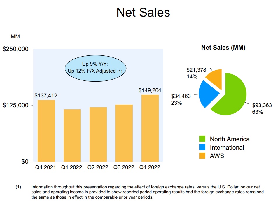 2022年第四季度,亚马逊净销售额增长9%,达到1492亿美元,而2021年第四季度为1374亿美元。扣除本季度汇率同比变化带来的50亿美元不利影响,净销售额比2021年第四季度增长12%。其中北美地区销售额同比增长13%至934亿美元,扣除汇率变化后增长14%。国际部门销售额同比下降8%至345亿美元,扣除汇率变化后增长5%。AWS部门的销售额同比增长20%,达到214亿美元。