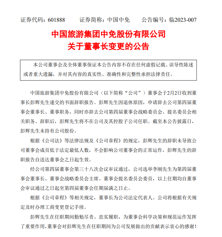 龙商网消息: 中国中免公告,彭辉先生因退休原因,申请辞去公司第四届董事会董事长、董事职务,同时亦辞去公司第四届董事会战略委员会、提名委员会相关职务。公司选举李刚先生为第四届董事会董事长、董事会战略委员会主席、董事会提名委员会委员。...