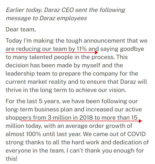 龙商网消息: 阿里巴巴集团旗下南亚电商平台Daraz首席执行官Bjarke Mikkelsen在一封致员工公开信中宣布,公司将裁员11%以适应未来几年较低的增长前景。 Mikkelsen称,这个决定是由我本人和领导团队做出的,目的是让公司为当前的市场现实做好准备,并确保Dara...