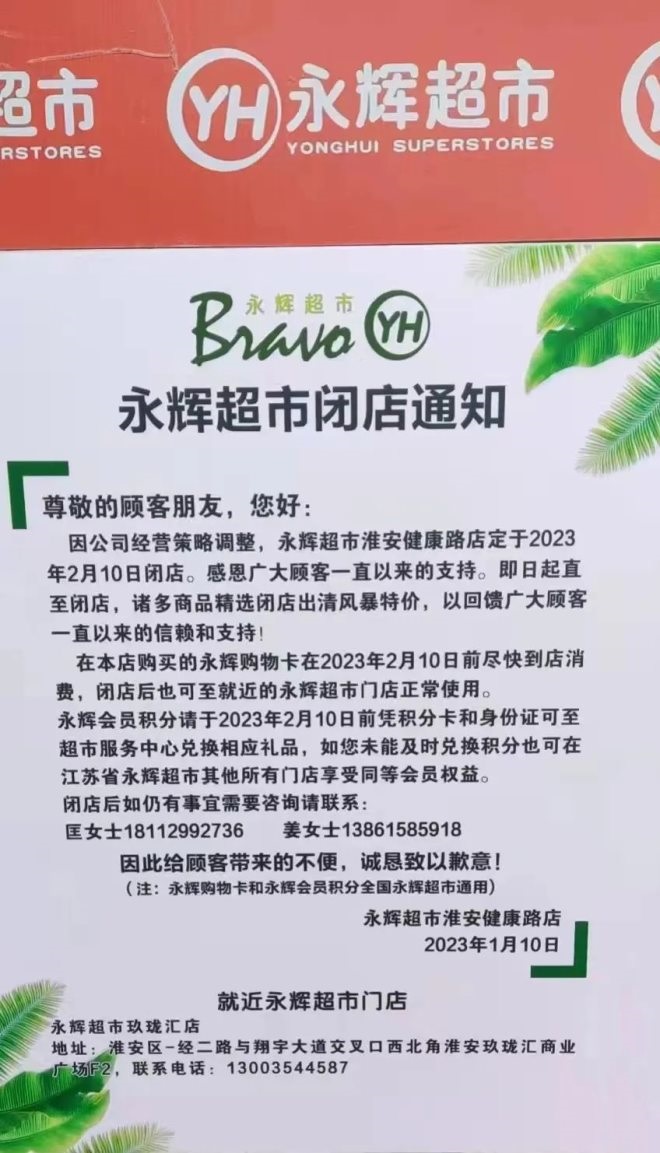 龙商网消息: 2月8日消息,因经营策略调整,永辉超市淮安健康路店将于2023年2月10日正式闭店。据悉,该店面积约3000平方米,拥有3万SKU,于2013年1月8日开业,已经经营超过10年时间。目前,门店内正在进行清仓打折。闭店公告强调,在本店购买的永辉购物卡在2...