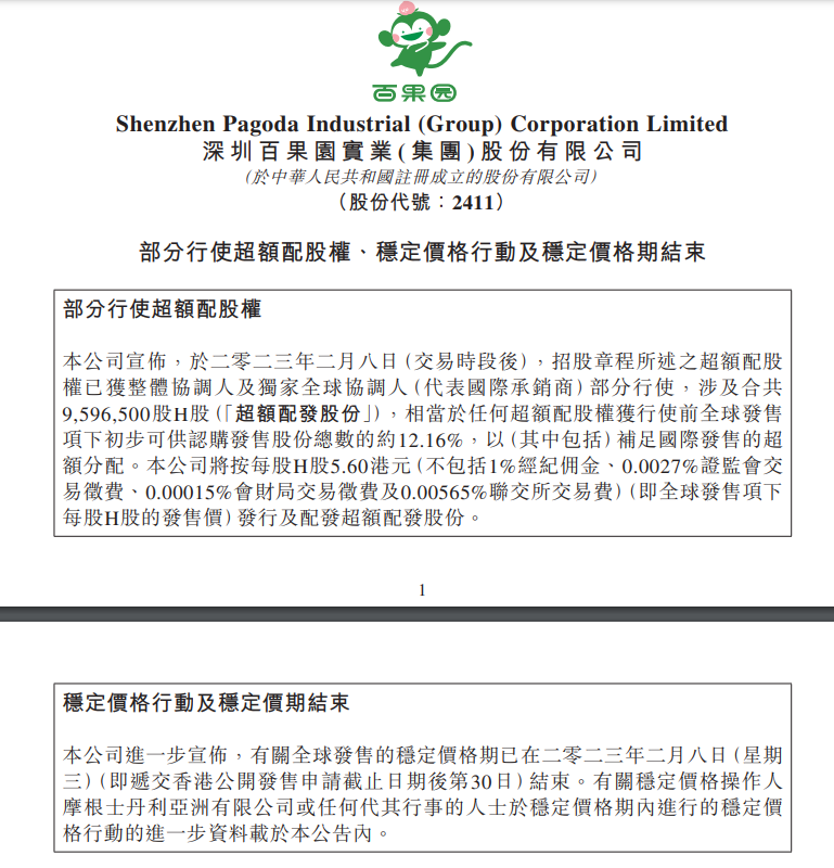 龙商网消息: 2月9日,百果园集团发布公告,于2023年2月8日,招股章程所述的超额配股权已获整体协调人及独家全球协调人 部分行使,涉及合共959.65万股H股,相当于任何超额配股权获行使前全球发售项下初步可供认购发售股份总数的约12.16%,以补足国际发售的超...