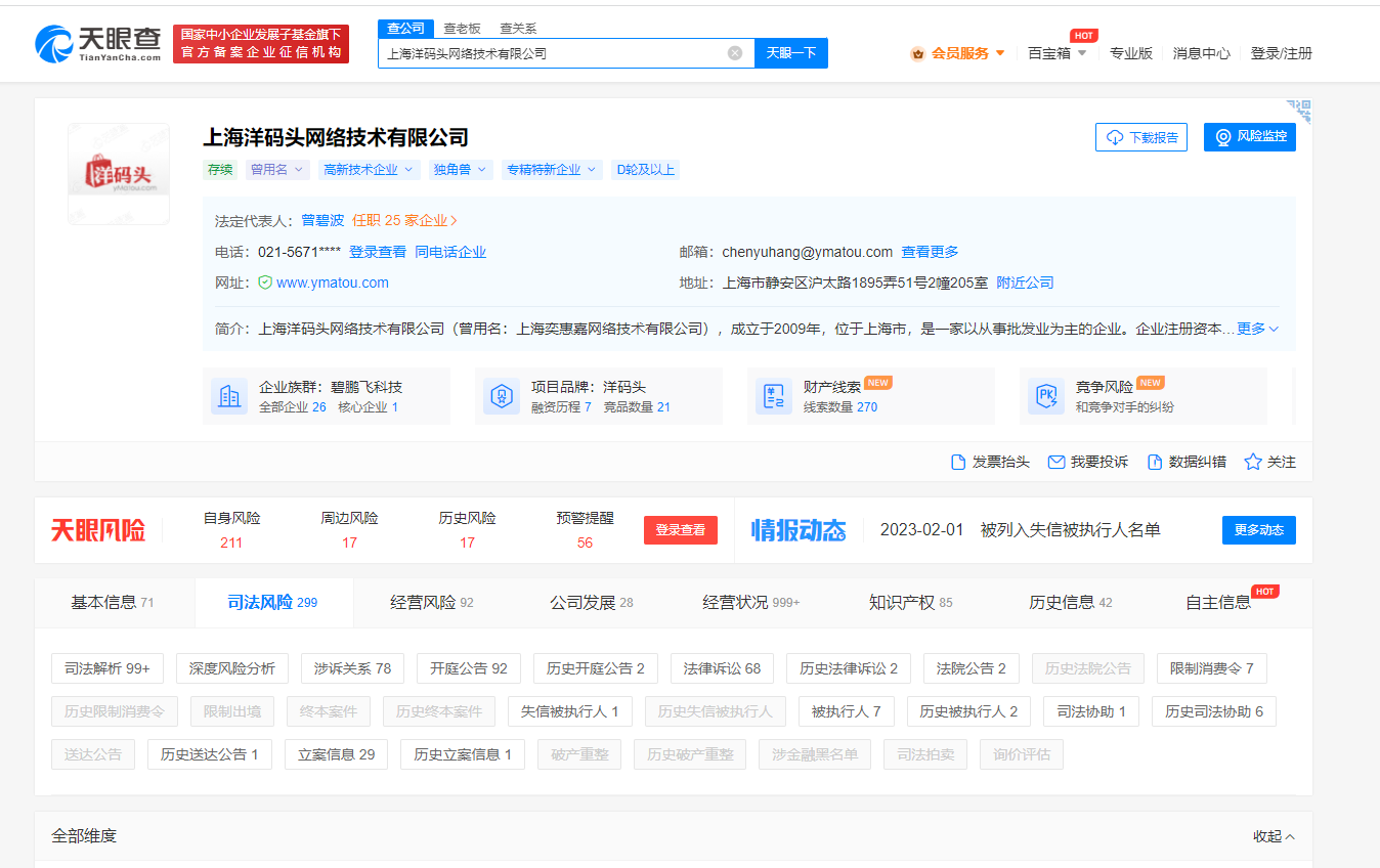 龙商网消息:天眼查App显示,近日,上海洋码头网络技术有限公司因有履行能力而拒不履行生效法律文书确定义务,被上海市第二中级人民法院列为失信被执行人(老赖)。今年1月,洋码头因该案件被强制执行71万余元。风险信息显示,该公司存在多条被执行人、限制消费令信息,被执行总金额超634万元。