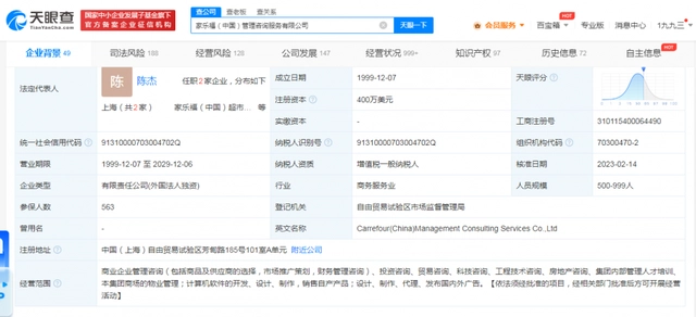 该公司成立于1999年12月,注册资本400万美元,经营范围含商业企业管理咨询、投资咨询、贸易咨询、科技咨询、房地产咨询等,由荷兰家乐福控股有限公司全资持股。