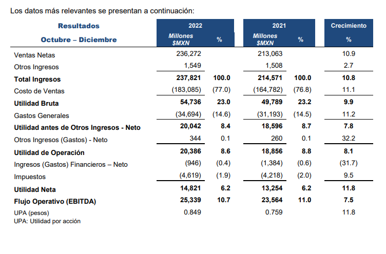 龙商网消息:沃尔玛墨西哥(Walmex)分公司近日发布了2022年第四季度财报。财报显示,该公司净利润为148亿墨西哥比索,比去年同期增长11.8%,这得益于墨西哥和中美洲销售额的两位数增长。2022年第四季度,沃尔玛墨西哥销售额(总收入)达2378亿比索,同比增长10.8%,略高于市场预期;EBITDA季度总额为253亿比索,同比增长7.5%;每股盈利0.849比索。在墨西哥,同店销售额(不包括过去一年开设的商店)增长了10.2%,这主要得益于Bodega商店和Sam's Club会员商店的增长;在中美洲,同店销售额增长12.7%,尼加拉瓜和哥斯达黎加的增幅最高。2022年全年,沃尔玛墨西哥销售额达8192亿比索,同比增长11.3%;净利润为489.7亿比索,同比增长11%;EBITDA年度总额为873.7亿比索,同比增长7.6%。