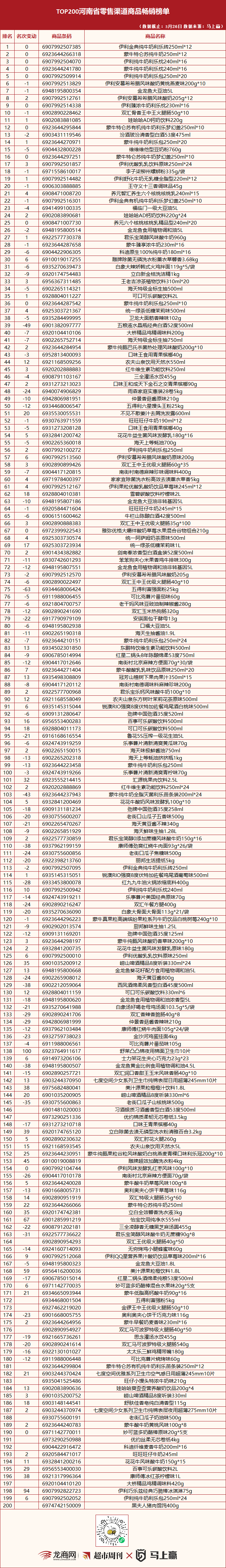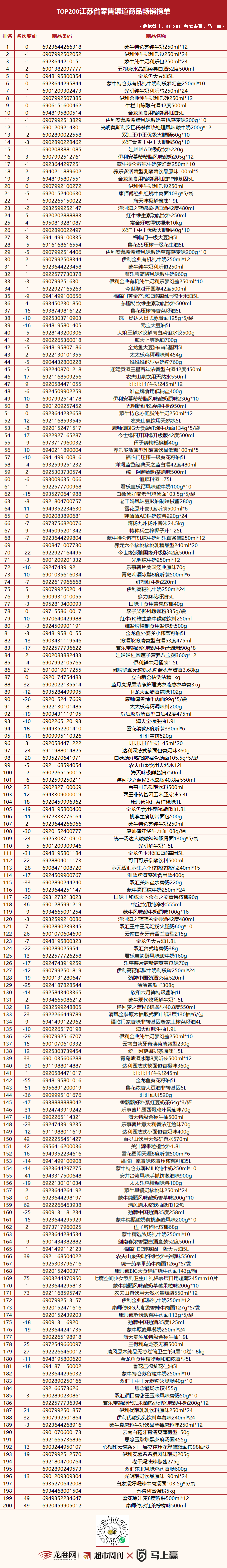 1. 本期江苏更新17品,更新率8.5%;河南更新15品,更新率7.5%。两地榜单中的相同单品共68品,占比34%,同为两地TOP10的3品:蒙牛特仑苏纯牛奶250ml*12、金龙鱼大豆油5L、伊利金典纯牛奶利乐砖250ml*12。