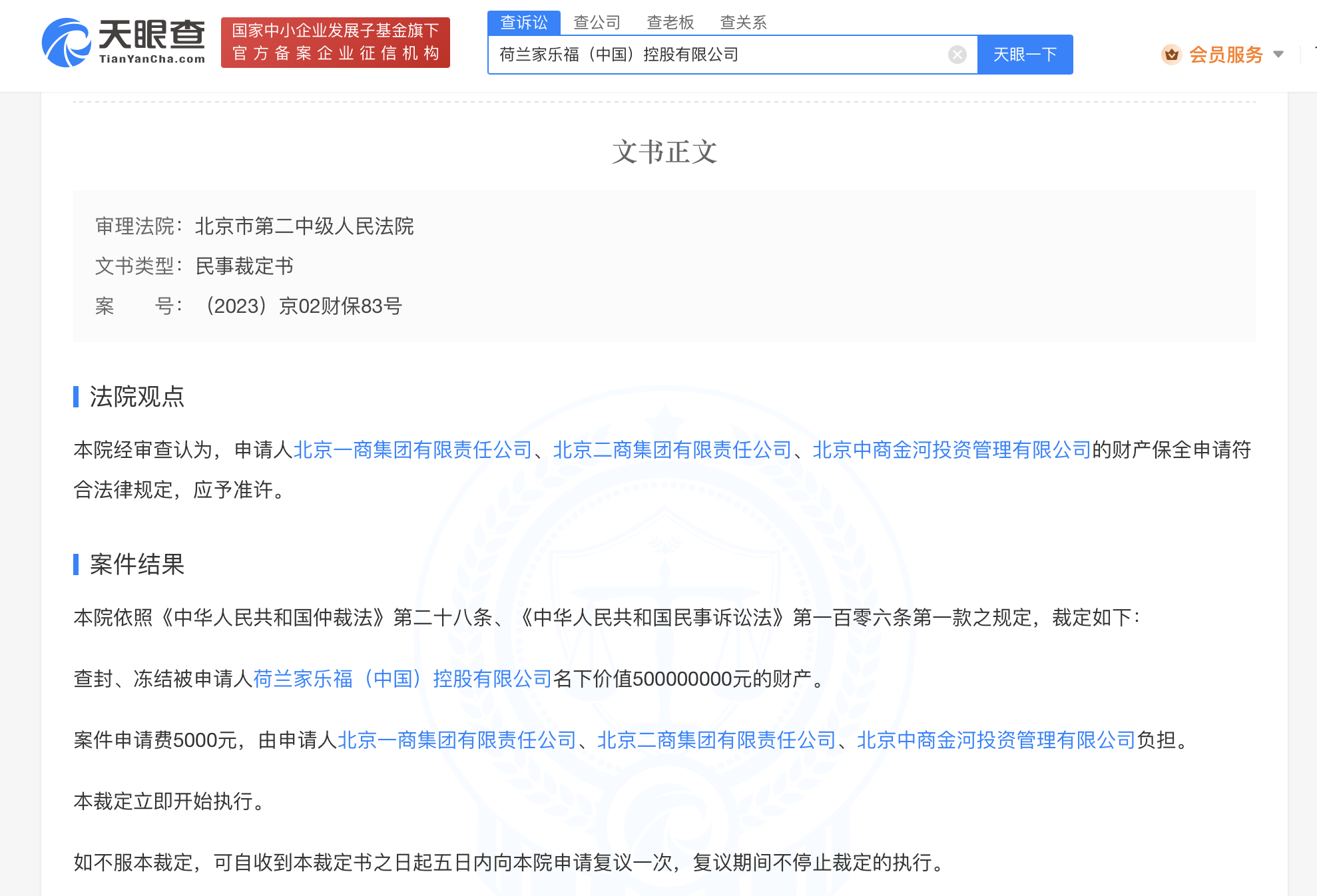 文书显示,北京一商集团有限责任公司、北京二商集团有限责任公司、北京中商金河投资管理有限公司向法院申请财产保全,请求查封冻结荷兰家乐福(中国)控股有限公司名下价值5亿元的财产。法院经审查认为该申请符合法律规定,裁定立即开始执行。