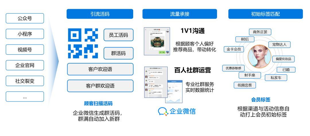 首先引流活码长期有效,可以极大的减少宣传成本。当扫码加入社群人数达到上限后,无需人工手动替换二维码,系统会自动创建新群承接顾客进群,若顾客无法加入群聊、或者群被解散等异常情况下,扫描活码还可以添加备用员工,防止社群客户流失。当顾客扫码进群后会根据其进入渠道自动发送欢迎语,并为其打上进入企业私域的初始标签,方便企业开展后期运营工作。