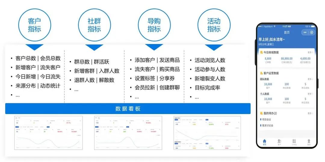除了对服务质量的管理,数据分析也是私域运营中非常重要的一环,以往顾客与一线员工在私域中的互动数据难以分析、跟进,企微助手在移动端和PC端同时提供了客户指标分析、社群指标分析、导购指标分析、营销活动分析等多维度的数据分析专题,让企业能够第一时间了解到一线员工在获客引流、社群运营、线上服务、营销转化等不同场景下的工作开展情况,以及顾客在私域全生命周期的数据指标,通过数据驱动私域运营工作的开展,持续提升企业私域运营能力。