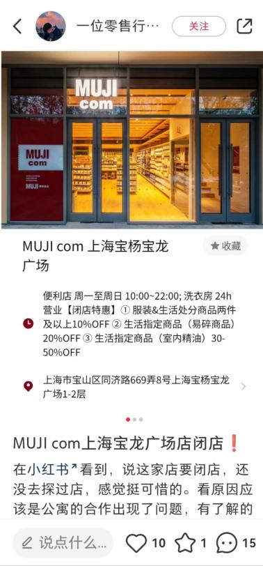 该店位于上海宝龙广场于2020年开业,是上海首家、也是中国第二家MUJIcom这家门店的关闭,也就意味着MUJIcom品牌在中国将仅剩下位于北京的唯一门店。针对其闭店原因,官方表示宝龙公寓的合作方因资金周转需要,对资产进行处理,因此双方合作的公寓和MUJIcom提前结束。