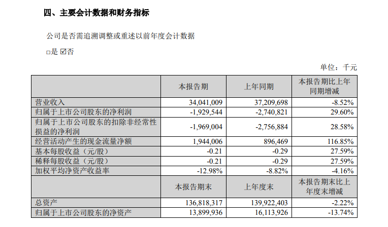 龙商网消息:苏宁易购日前发布2023年半年度报告。报告期内,苏宁易购实现营业收入340.41亿元,同比减少8.52%;归属于上市公司股东净亏损19.30亿元,同比收窄29.60%;归属于上市公司股东的扣除非经常性损益净亏损19.69亿元,同比收窄28.58%;基本每股亏损0.21元/股。