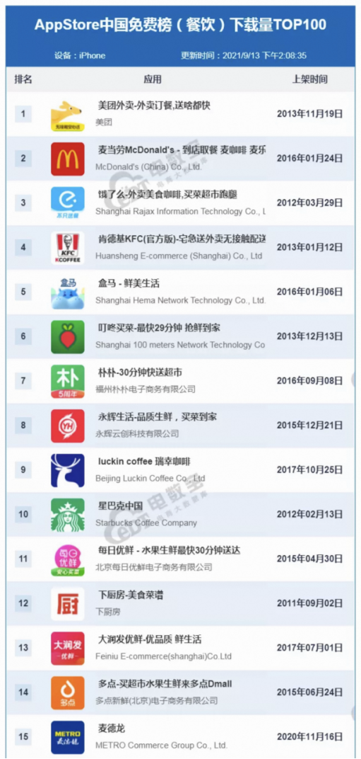 龙商网消息:9月21日,我国“一带一路”TOP10影响力社会智库网经社电子商务研究中心(100EC.CN)联合网经社数字生活台发布《2023年9月AppStore中国免费榜(餐饮)TOP99》,报告基于iPhone 终端的下载量数据,统计了9月份(数据截至9月21日14:16分)餐饮类APP下载排名,反映用户使用偏好。