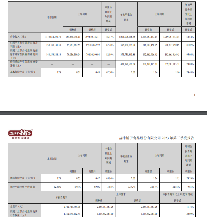 龙商网消息: 盐津铺子10月30日晚间公告,公司前三季度营业收入30.05亿元,同比增长52.54%;归母净利润3.96亿元,同比增长81.07%;基本每股收益2.07元。...