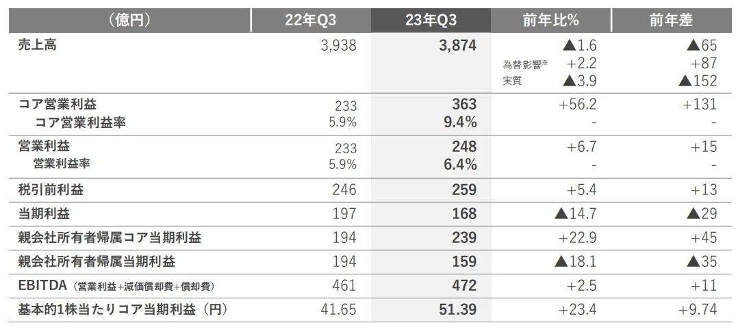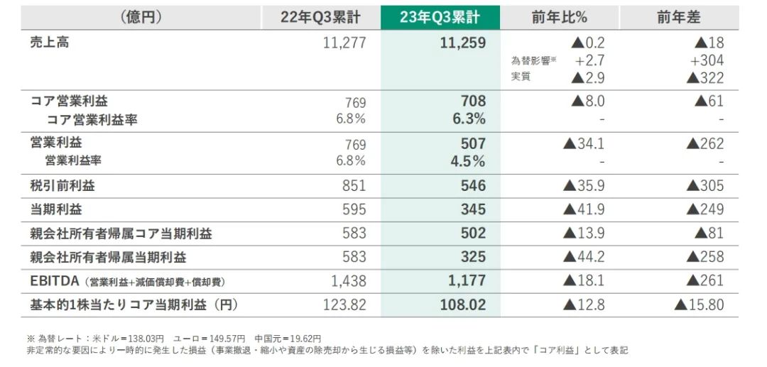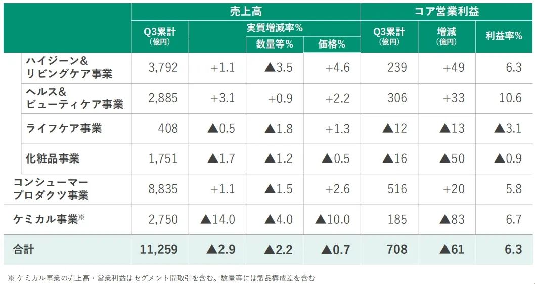 仅就第三季度而言,花王的销售额达到3874亿日元(约合人民币186.89亿元),相较去年减少65亿日元(约合人民币3.14亿元),同比下降1.6%。考虑到汇率的影响,实际下降达到3.9%。核心营业利润为363亿日元(约合人民币17.51亿元),较去年增加131亿日元(约合人民币6.33亿元),同比增长56.2%。这一季度的表现显示了花王在面对市场波动和汇率波动的同时,成功实现了核心营业利润的显著增长,表明公司在管理和经营方面取得了积极的成果。