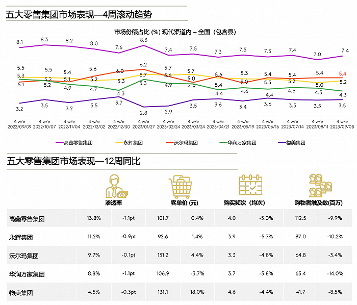 不过,从消费者研究公司凯度(Kantar)最新发布的“五大零售集团市场表现”显示,高鑫零售集团9月份在市场份额、客单价表现都较上个月有了一定比例的提升。