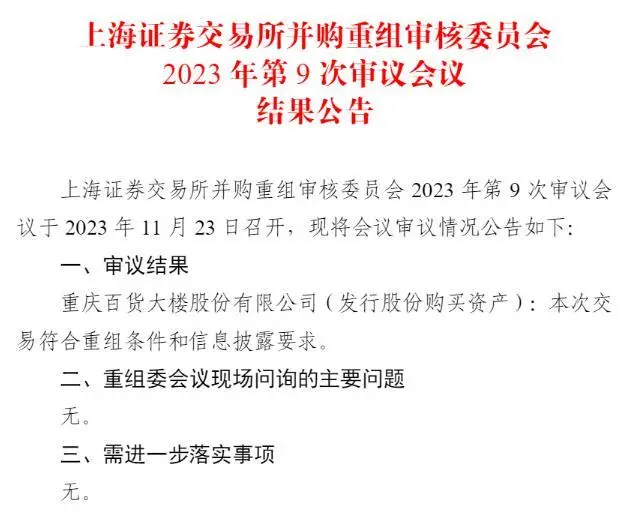 龙商网消息:11月23日晚间,重庆百货发布公告称,拟通过向重庆商社(集团)有限公司全体股东发行股份的方式吸收合并重庆商社事项,获上交所并购重组审核委员会审核通过。本次重组尚需获得中国证监会同意注册的决定后方可实施。