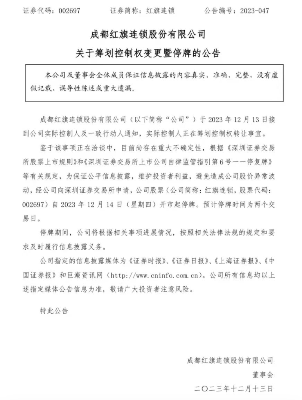 龙商网消息: 13日晚间,红旗连锁发布公告称接到公司实际控制人及一致行动人通知,实际控制人正在筹划控制权转让事宜。鉴于该事项正在洽谈中,目前尚存在重大不确定性,经申请公司股票自12月14日开市起停牌,预计停牌两个交易日。业界目前普遍关注永辉在这次...