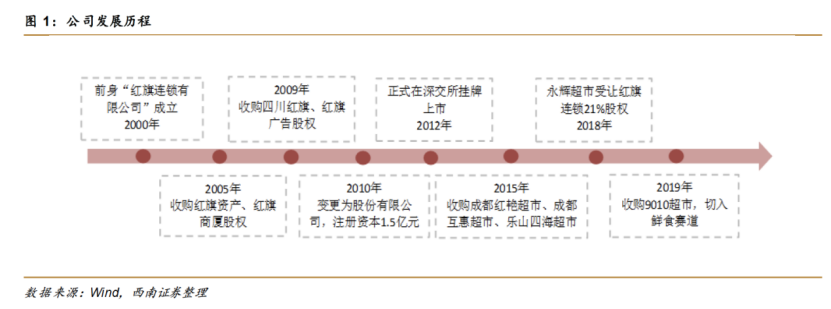 红旗连锁创立于2000年6月,至今已有20余年的发展历史,主要服务区域位于成都,并逐渐向成都周边及四川地区扩张。公司以平均200平米左右的连锁便利超市作为其主营业态,依托社区提供便利服务,并于2012年成功登陆A股。