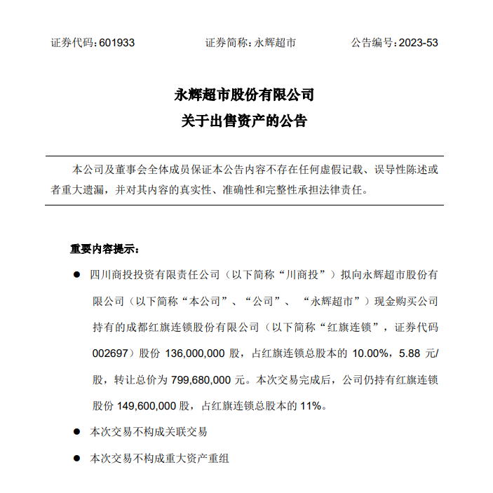龙商网消息: 12月20日晚,永辉超市发布公告称,川商投拟向公司现金购买公司持有的红旗连锁(002697)股份1.36亿股,占红旗连锁总股本的10%,每股转让价格5.88元/股,转让总价为8亿元。交易完成后,公司仍持有红旗连锁股份1.5亿股,占红旗连锁总股本的11%。...