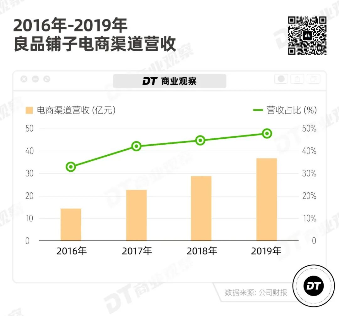 2015年,良品铺子线上销售额超过8.2亿元。2016年,良品铺子斩获双十二休闲零食类目第一的头衔。根据良品铺子招股书,在2016-2019年间,公司主营业务中,线上收入占比从33.69%上升至48.58%。