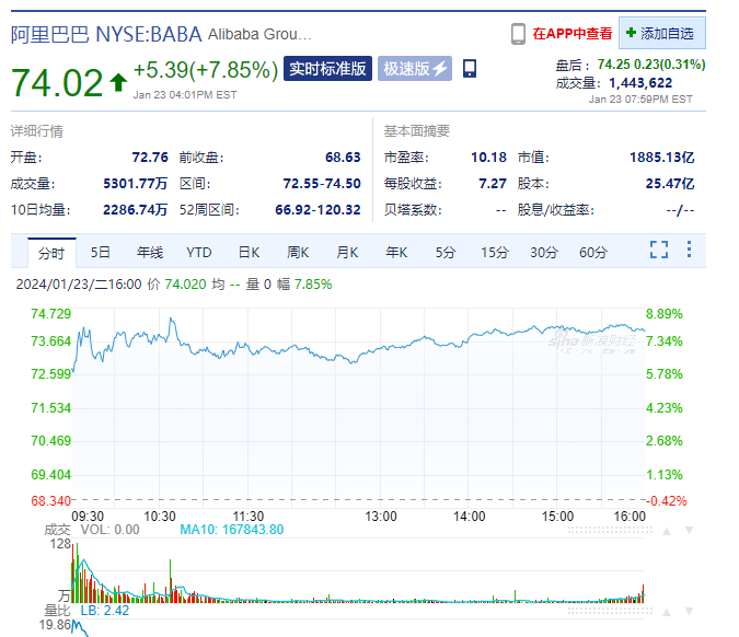龙商网消息:据中证报,针对“阿里巴巴集团创始人马云、蔡崇信近期大幅增持阿里股票”一事,记者从阿里巴巴集团确认了这一消息。阿里巴巴集团表示,这体现对阿里巴巴前景非常看好,对公司未来发展、对管理团队及战略方向充满信心。受上述消息影响,阿里巴巴美股当日一度大涨超8%,收盘报74.02美元/ADS,涨7.85%,总市值回升至1878.3亿美元。