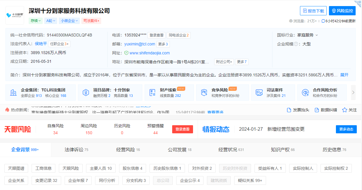 龙商网消息:天眼查信息显示,深圳十分到家服务科技有限公司发生工商变更,原股东国美资本旗下企业退出,京东旗下江苏京东邦能投资管理有限公司成为新股东。据悉,此举为国美零售与京东之间1亿美元可换股债券协议的一部分,涉及出售深圳十分到家约21.65%的股权,代价1.05亿元。此次变更后,京东将通过江苏京东邦能持有该公司相应股权。据天眼查,深圳十分到家服务科技有限公司成立于2016年5月,法定代表人为侯艳平,注册资本约3899万人民币,是一家以从事居民服务业为主的企业。经营范围包含:提供家政服务;家用电器、家具家居、水电设备、办公设备、数码产品、手机、电脑的上门安装、保养、维修、清洁、检测;智能家电设备的技术研发及销售等。