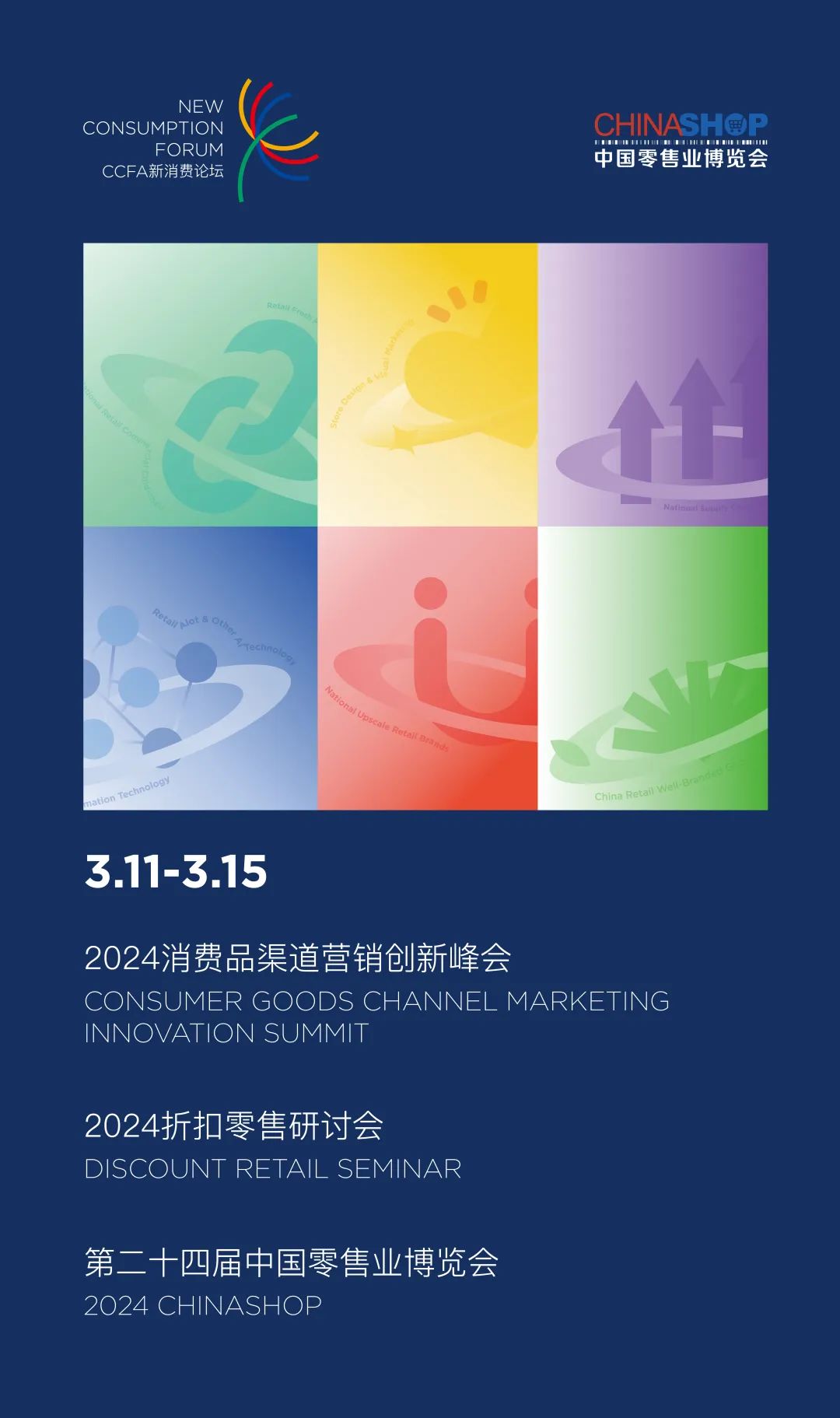 3月11-15日,由中国连锁经营协会主办的CCFA新消费论坛——2024消费品渠道营销创新峰会、第二十四届中国零售业博览会(2024CHINASHOP)及CCFA折扣零售研讨会、CHINASHOP研修营进阶之旅等会议、展览、访学活动将在上海接连举办。