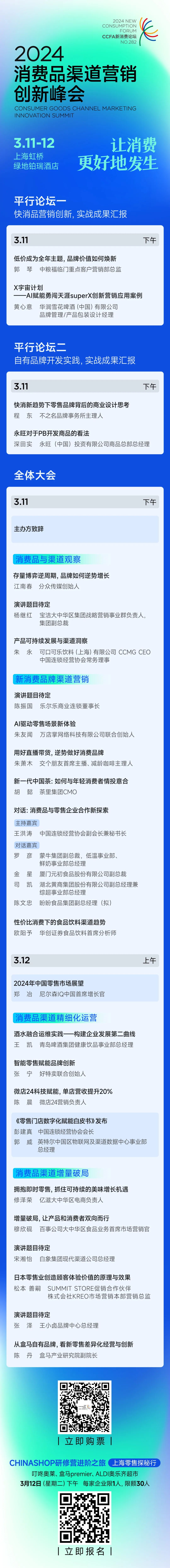 这场零售盛宴将由2024消费品渠道营销创新峰会率先开场。峰会将以“让消费更好地发生”为主题,于3月11-12日在上海虹桥绿地铂瑞酒店举行。