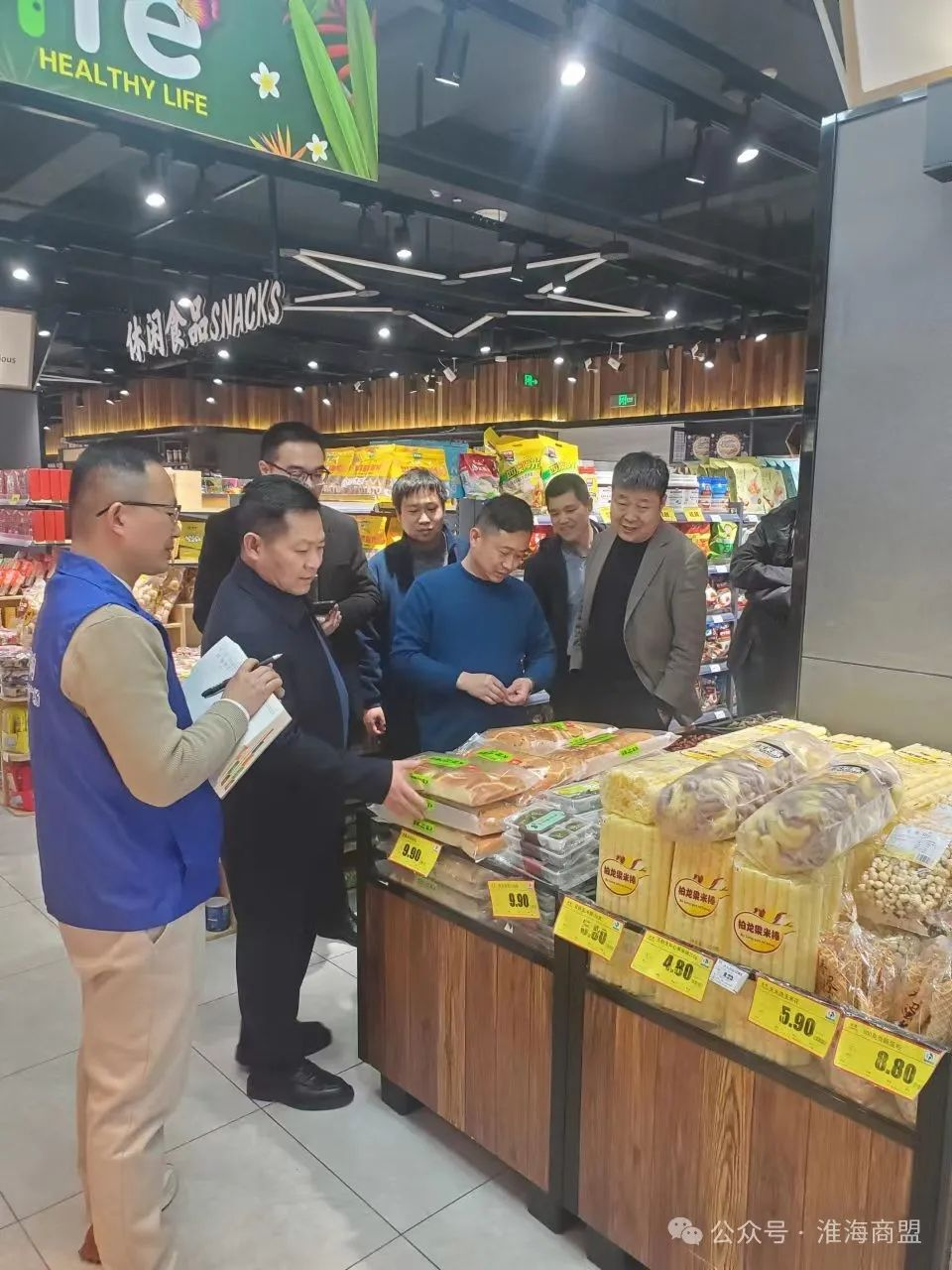 ▲3月16-17日,淮海商盟会长许治、副会长郑银良一行在扬州、盐城、宿迁等地零售市场调研。图为许治一行在阜宁永乐购精品超市凤凰文化广场店、向阳路店巡店指导,公司董事长邵小飞等陪同