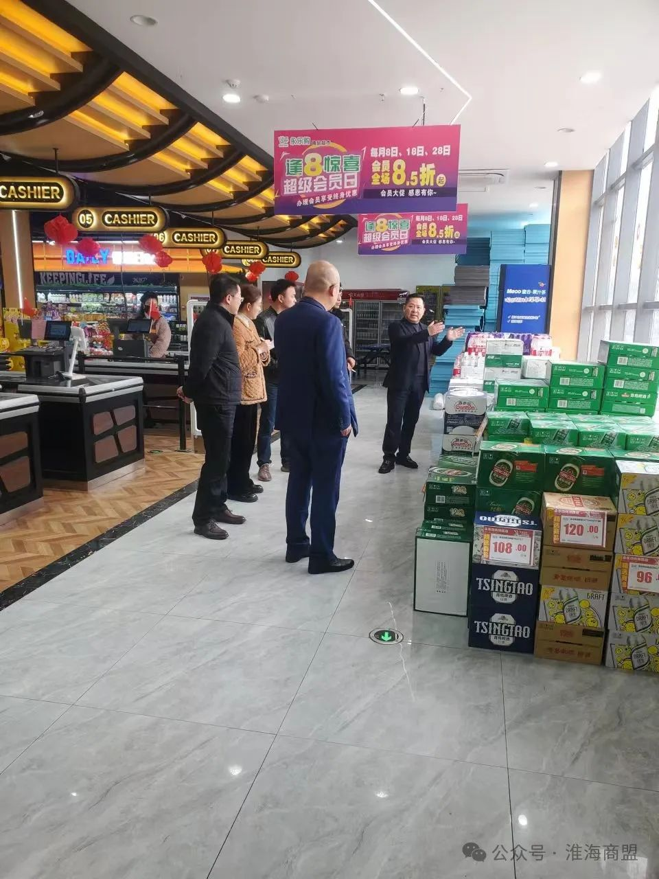 ▲3月16-17日,淮海商盟会长许治、副会长郑银良一行在扬州、盐城、宿迁等地零售市场调研。图为许治一行在高邮好享易购超市武安店、兴业店、碧桂园店、万和城店巡店指导,公司董事长翟东阳等陪同
