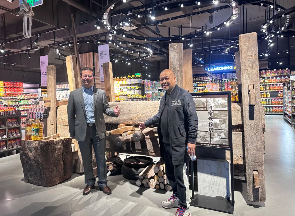 肖玉在粮油区的肖家老榨坊介绍了榨坊的传统工艺及故事。在售卖的自制辣椒酱柜台前,向彭建真讲解不同辣椒的不同吃法。正是因为雅斯上上下下对商品深度的挖掘,才有了如今雅斯卖场的丰富及商品多样化。