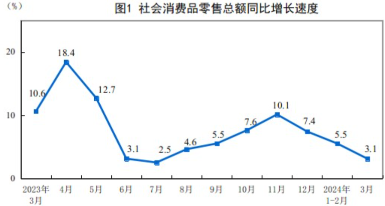 按经营单位所在地分,3月份,城镇消费品零售额33843亿元,同比增长3.0%;乡村消费品零售额5177亿元,增长3.8%。1-3月份,城镇消费品零售额104280亿元,增长4.6%;乡村消费品零售额16047亿元,增长5.2%。