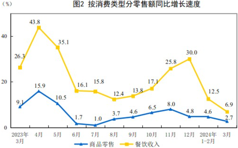 按消费类型分,3月份,商品零售35056亿元,同比增长2.7%;餐饮收入3964亿元,增长6.9%。1-3月份,商品零售106882亿元,增长4.0%;餐饮收入13445亿元,增长10.8%。