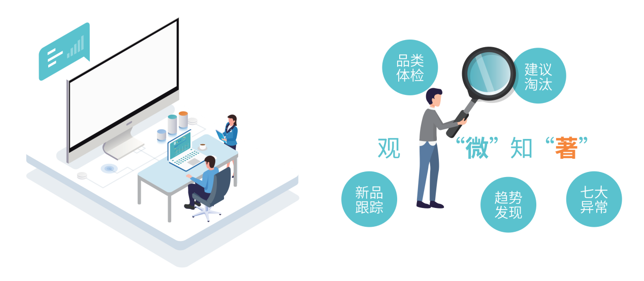 监控包括商品滞销、SKU数过多、品类结构不合理、实时业绩变化等问题在内的六大异常:重点商品异常、门店业绩异常、部门业绩异常、库存管理异常、品类结构异常以及促销活动异常,主动推送给门店管理人员,针对性分析问题,让企业变被动为主动。