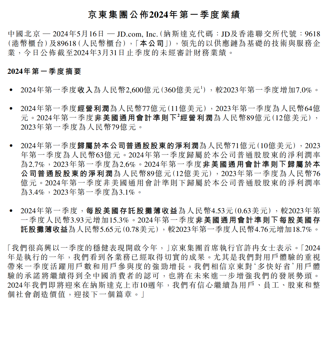 报告显示,2024年第一季度,京东收入为人民币2600亿元,较2023年第一季度增加7.0%;经营利润为人民币77亿元,2023年第一季度为人民币64亿元;非美国通用会计准则下经营利润为人民币89亿元,2023年第一季度为人民币79亿元;归属于本公司普通股股东的净利润为人民币71亿元,2023年第一季度为人民币63亿元;归属于本公司普通股股东的净利润率为2.7%,2023年第一季度为2.6%;非美国通用会计准则下归属于本公司普通股股东的净利润率为3.4%,2023年第一季度为3.1%;每股美国存托股摊薄收益为人民币4.53元,较2023年第一季度人民币3.93元增加15.3%;非美国通用会计准则下每股美国存托股摊薄收益为人民币5.65元(0.78美元),较2023年第一季度人民币4.76元增加18.7%。