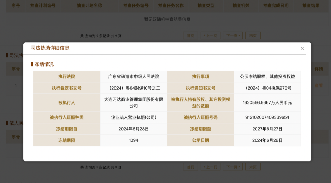 近日,大连新达盟商业管理有限公司(以下简称“新达盟”)新增一则股权冻结信息,被执行人为大连万达商业管理集团股份有限公司(以下简称“万达商管”),冻结股权数额约162亿元,冻结期限自2024年6月28日至2027年6月27日,执行法院为广东省珠海市中级人民法院。